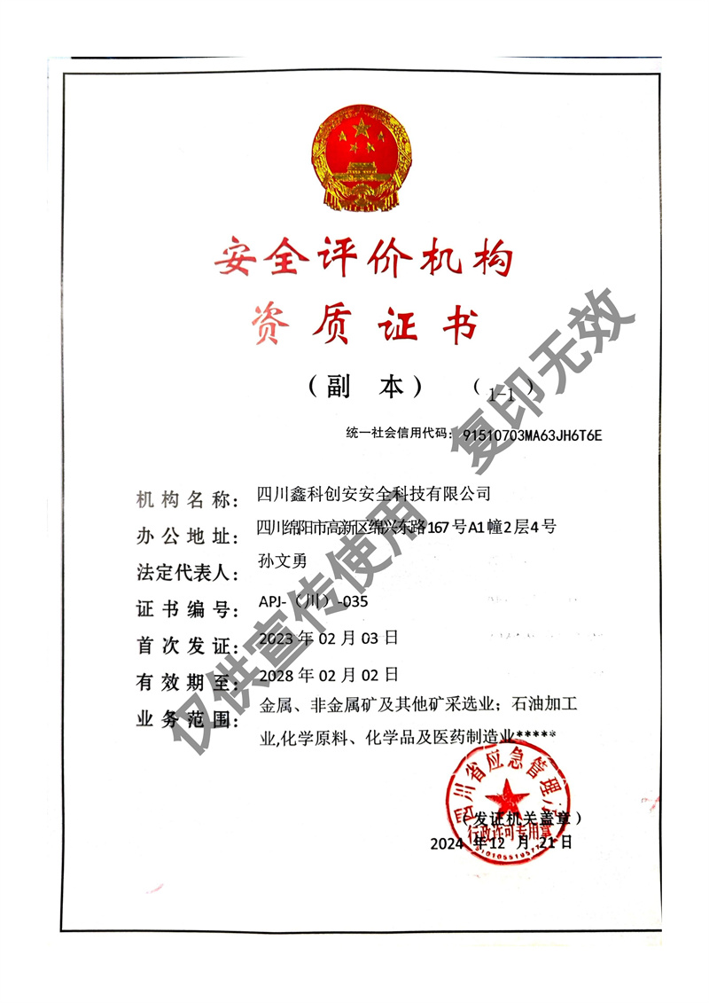 四川鑫科創(chuàng)安安全科技有限公司成立于2020年,是川北地區(qū)取得資質(zhì)的民營安全評(píng)價(jià)機(jī)構(gòu)(資質(zhì)證書編號(hào):APJ-(川)-035)。并于2022年?duì)款^成立綜合應(yīng)急救援隊(duì)伍 - 綿陽曙光應(yīng)急救援中心。